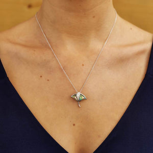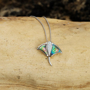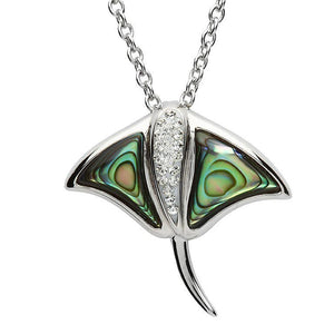 The wings of the manta ray fish look breathtakingly beautiful with their shell inlay. The body of the fish is embellished with the tiniest and shiniest Swarovski® crystals. The tail is left plain to harmonize the opulence. The pendant is kept bail-free for a streamlined look. Manta ray is an ancient symbol of the ability to stay calm and unruffled under all kinds of circumstances. Paua or abalone shell signifies protective energies of the ocean. This pretty and anytime wear necklace brings together these qualities to help the wearer stay calm and feel protected.
