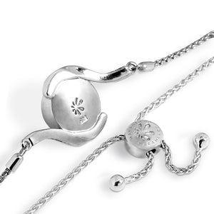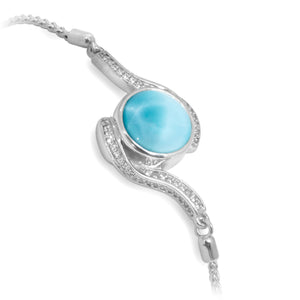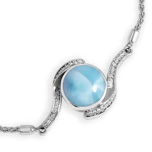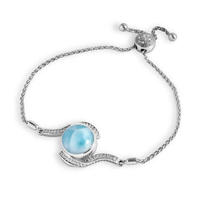 A gorgeous statement of brilliance and grace, our Adella bolo bracelet is set with 2 twists of white sapphires that gently embrace the exquisite round bezel-set Larimar gemstone. It’s as unique as you and can be worn for any occasion!