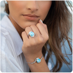 Product Details: 12mm Larimar gemstone with 56 pieces of 1mm white sapphire and sterling silver. Every piece of larimar contains slightly different hues, color saturations, and markings that give it its unique and compelling qualities. As a result, the larimar in your jewelry may appear slightly different from the larimar depicted online.