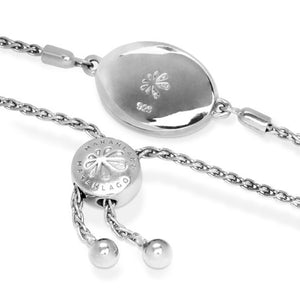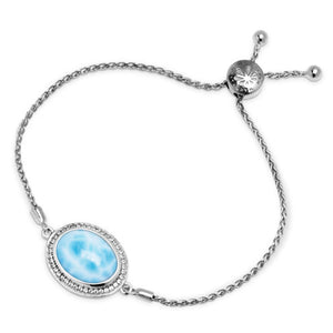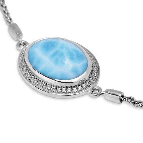 With elegance and unabashed beauty, our Clarity Oval bracelet features a gorgeous oval larimar, ringed with brilliant white sapphires, set on a sterling silver chain. A look of sheer perfection!