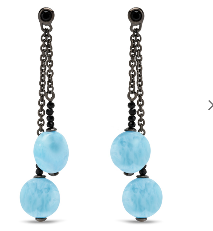 Our Galaxy earrings are a delightful composition of globes of larimar suspended from strands of black spinel. Light and breezy yet magical as the midnight sky. Perfectly paired with Galaxy necklaces!