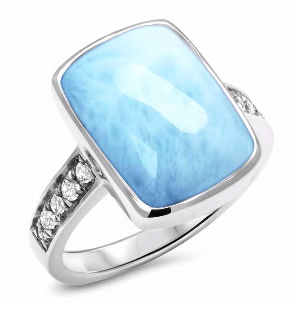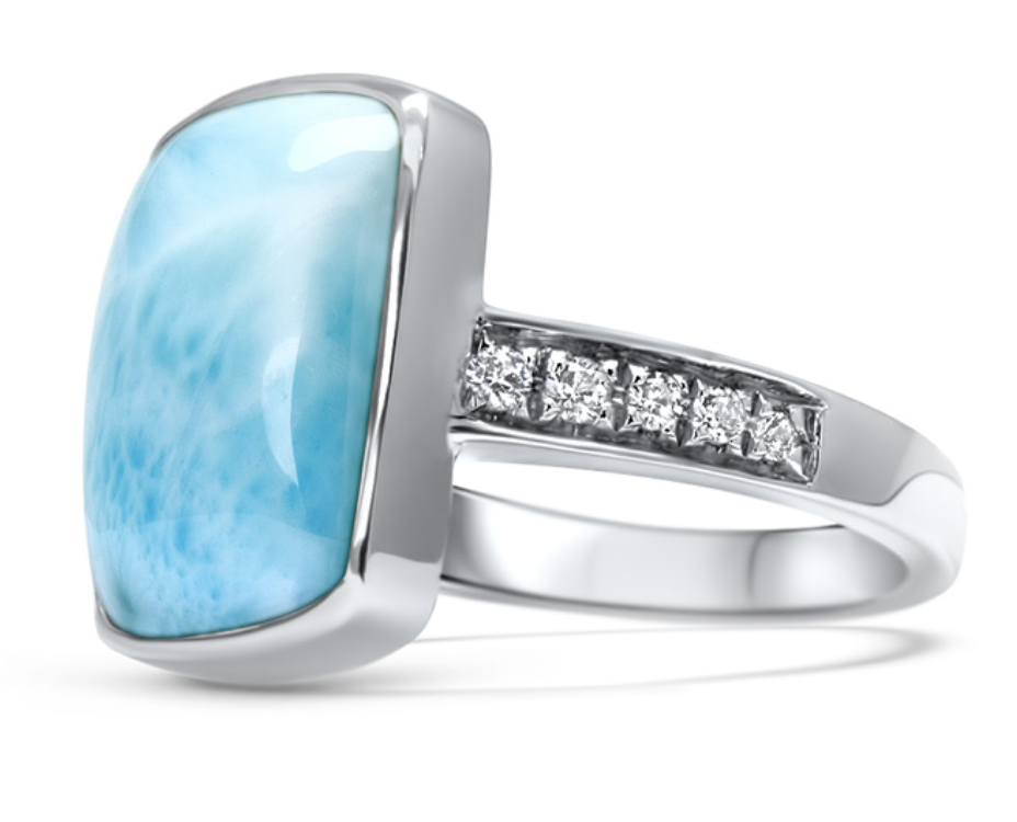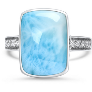 Our Maris ring is a study in beauty, elegance, and rich texture. A rectangle of our luminous larimar is wrapped in sterling silver and accompanied by white sapphires on the band. Simply gorgeous.