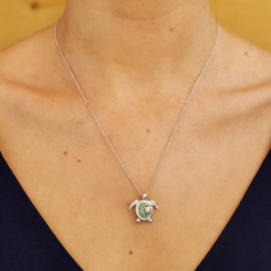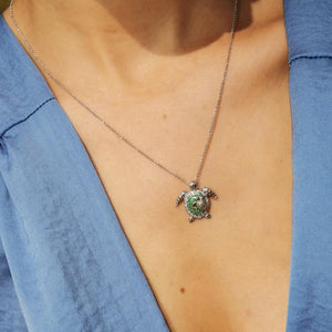 The pendant features a cute mom and rose gold baby turtle pair. The mom turtle is in silver with a silver-outlined turquoise blue shell studded with clear crystals. The rose gold baby figure resting on top of its mother’s shell creates a fetching contrast. A thin silver chain goes through the head of the bail-free pendant to complete the necklace.