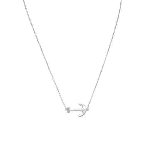 Make a splash with this 16" + 2" extension rhodium plated sterling silver sideways anchor necklace. The anchor is approximately 8mm x 16mm. The necklace has a spring ring closure.