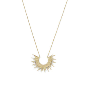 Here comes the sun...16" + 2" extension 14 karat gold plated sterling silver cable chain necklace featuring a fixed sunburst design pendant measuring 1.75" x 1.25". This necklace has a lobster clasp closure. .925 Sterling Silver