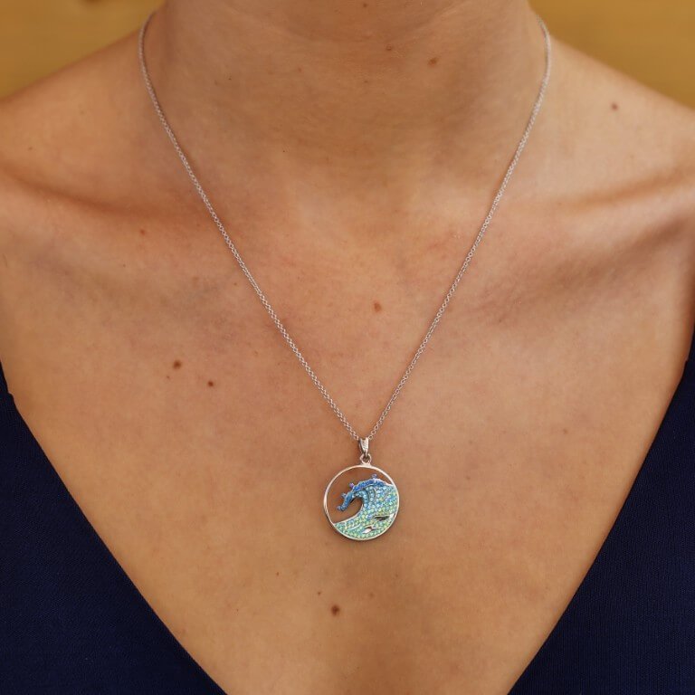 The circle features a diagonally rising sea wave in hues of light and dark blue. The crest is a darker blue with sparkling Swarovski® crystals in matching hue. The lower part of the wave is made of progressively lighter shades of blue studded with clear Swarovski® crystals. The ocean is a symbol of life and its riches. The rising waves signify upsurge of emotions. The gentle swell of this gorgeous accessory reflects happiness and peace. Wear this necklace on a special outing on a joyous occasion and let your happiness be seen in style. You can also pair this necklace with the matching wave drop earrings from our range.