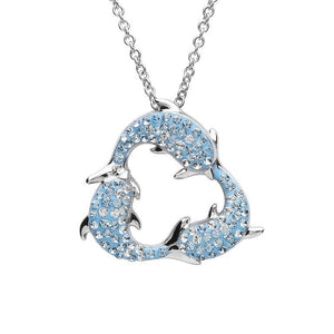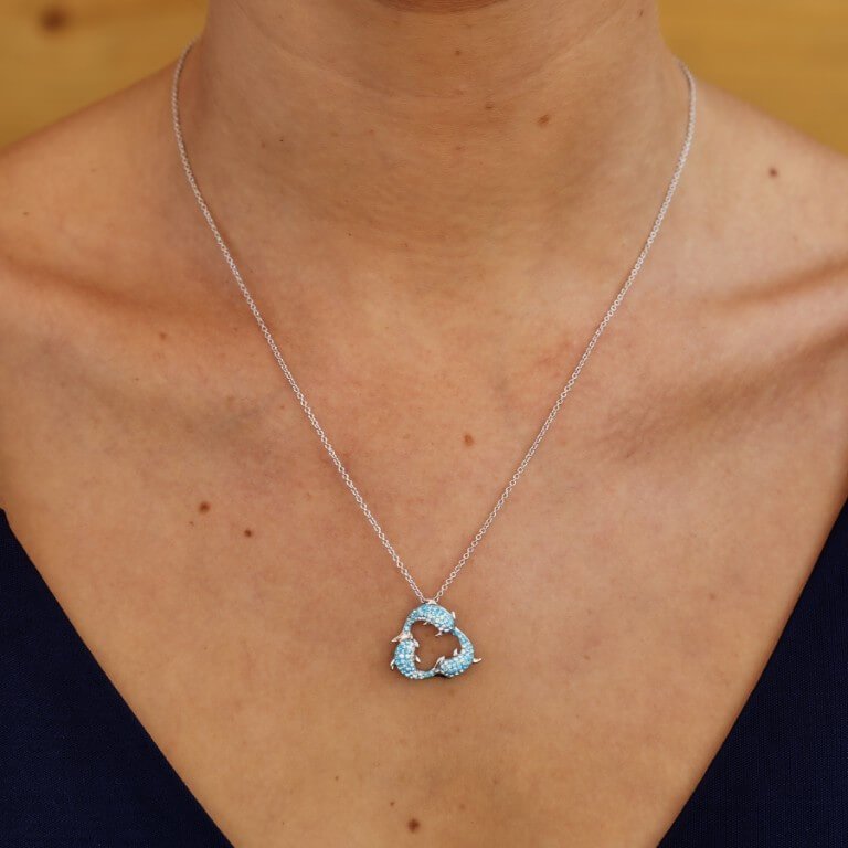 The Blue Dolphins Trio Pendant Necklace is a winsome aquatic-themed accessory crafted in Sterling silver to glamorize your formal and semi-formal wardrobe. The pendant features three tail-to-mouth dolphins creating an attractive rounded-corner triangular shape.