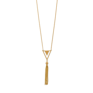 Triangles and tassels, what a treat! 32"+2 14 karat gold plated sterling silver necklace features a triangular and tassel drop. Drop length is 3.25". This necklace has a spring ring closure. .925 Sterling silver