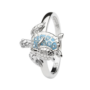 The aqua Mother & Baby Turtle ring has been crafted in sterling silver and embellished with sparkling clear Swarovski crystals and hints of turquoise color.