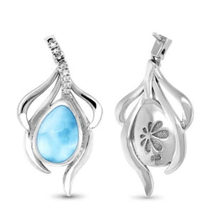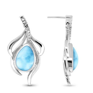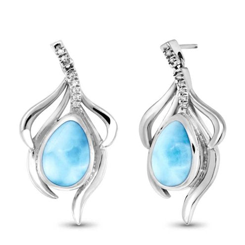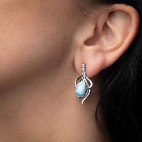 These graceful earrings virtually dance with beauty, as tendrils of sterling silver and white sapphires embrace a teardrop of luscious larimar! They will elevate any outfit! Pairs perfectly with the Willow necklaces in this collection.